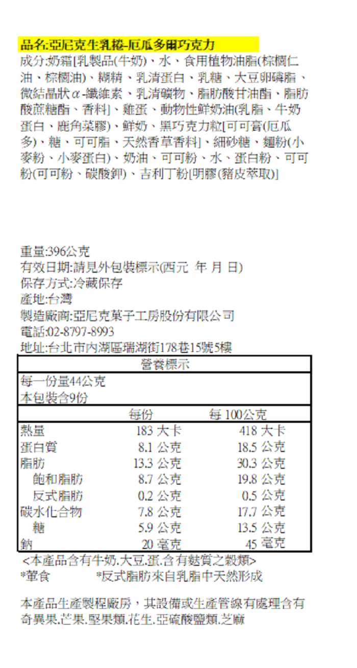 | 商品名稱 | 【亞尼克】厄瓜多爾巧克力生乳捲12入 |