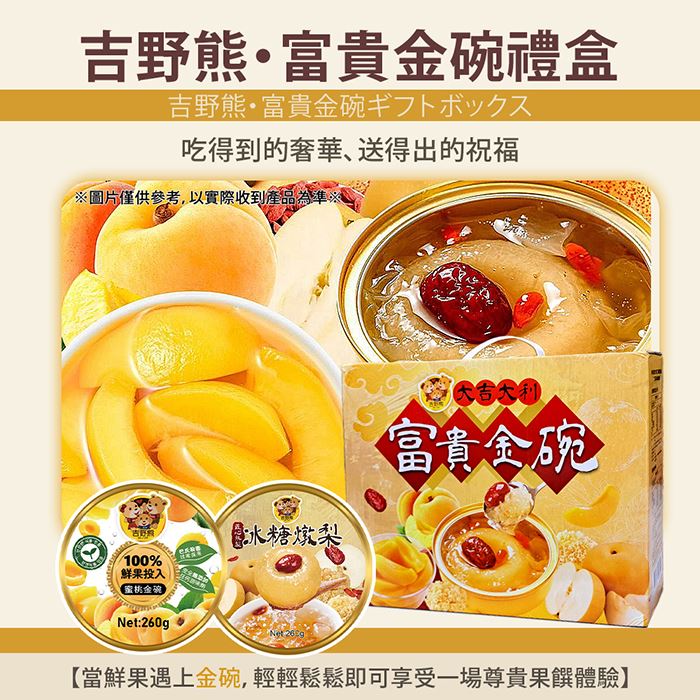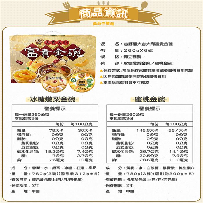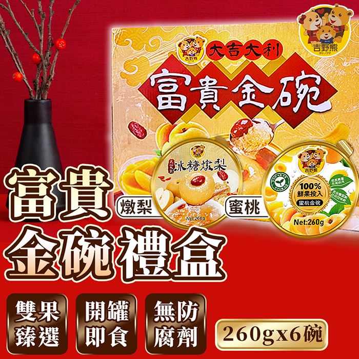 | 商品名稱 | 《吉野熊》大吉大利富貴金碗禮盒(燉梨x3+蜜桃x3) |