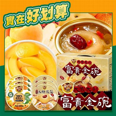 | 包裝內容/商品規格 | 冰糖燉梨-780g(3碗) (固狀物312g±5%) 蜜桃金碗-780g(3碗) (固狀物390g±5%) |