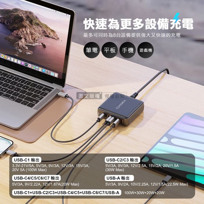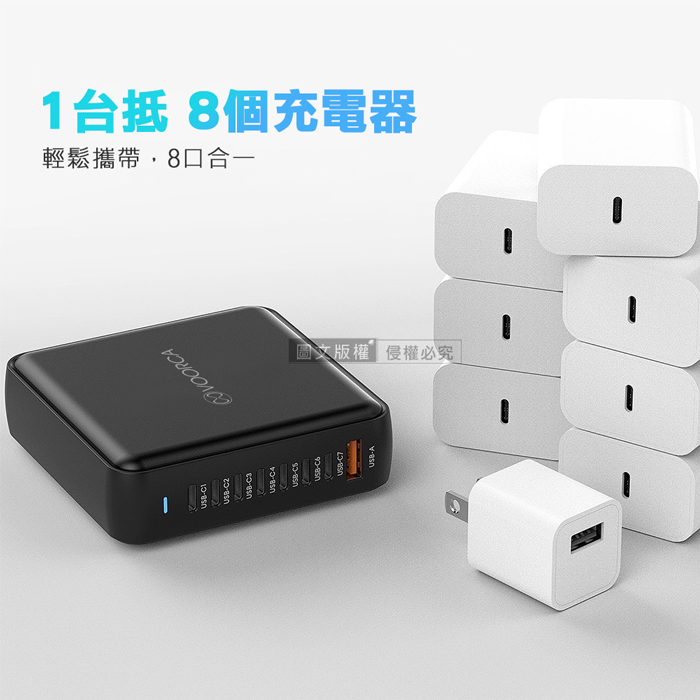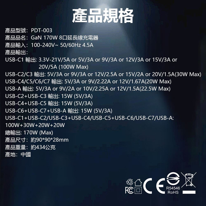 氮化鎵GaN|170W總輸出|1USB-A+7USB-C