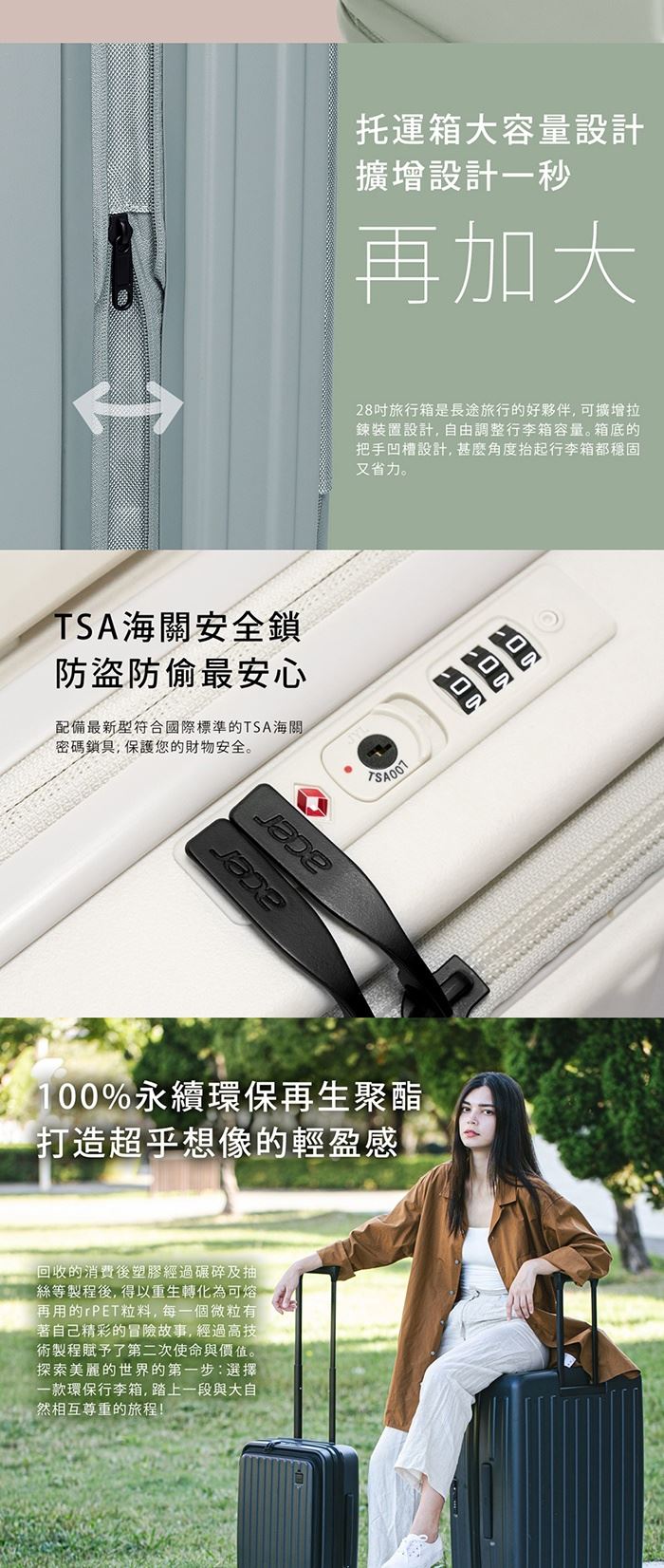 | 【商品規格】 | 25吋 (45 x 25 x 68 cm) 容量:65L/擴充後:75L 重量:4.3kg 28吋(53 x 31 x 77 cm) 容量 : 88L /擴充後:100L 重量 : 5.7 kg |