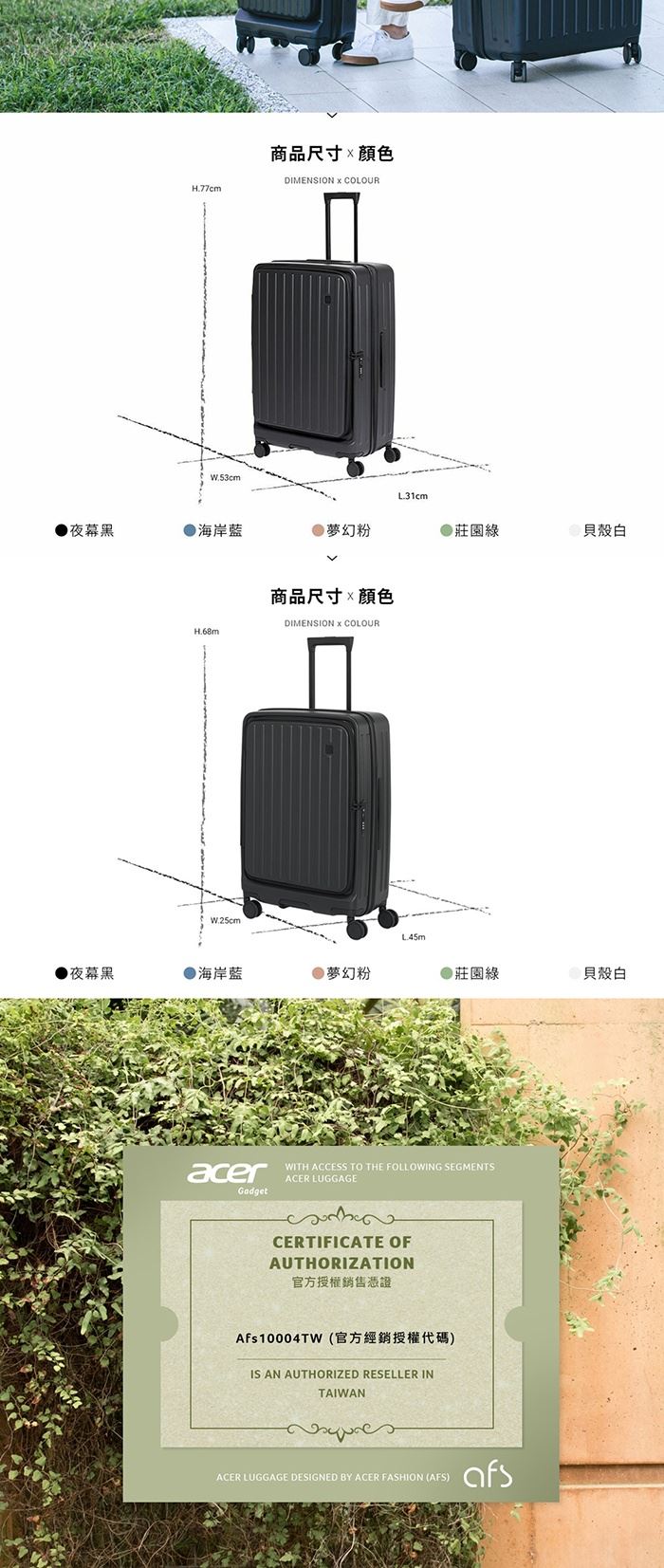 Acer行李箱保固:原廠保固:12個月 保固內容:於電商平台、經銷代理商及其他團購通路購買而需返修者,憑保固卡/發票/購買證明/序號標,享有12個月免費保固。若已超過保固期將酌收費用(例:服務費、運費)。 保固範圍:行李箱外在可替換零件如拉桿、輪子、輪座、手把、海關鎖。 非保固範圍:箱體外殼、拉鍊、內裡布、束/織帶、行李箱內部零件、拉鍊片、拉鍊頭…等五金配件。 商品使用上有任何不清楚地方請勿私自蠻力破壞,建議拍照/影片等方式詢問原廠或經銷平台通路,以避免影響保固權益。 ※所有商品外殼(含軟硬箱)均不再保固項目內;因外力因素造成損壞如機場託運、貨運寄送等因素,請逕向航空/貨運公司提出索賠要求,本公司不列於保固範圍。 |