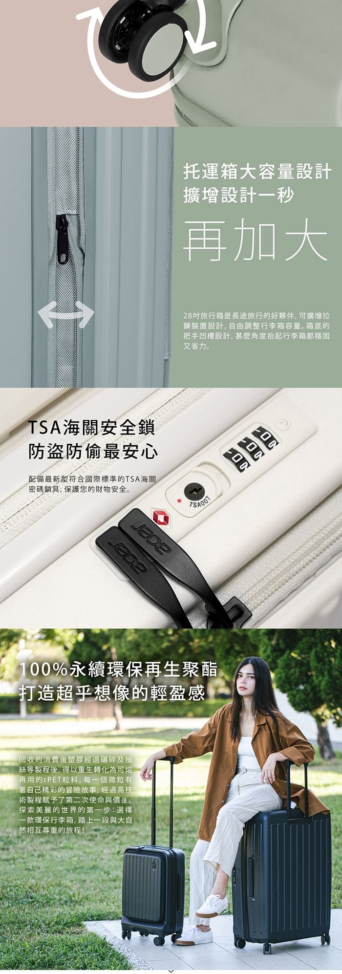 | 【商品規格】 | 20吋 (35.5 x 20.5 x 53.5 cm) 容量 : 40L/ 擴充後:45L 重量 : 3.1 kg 25吋 (45 x 25 x 68 cm) 容量:65L/擴充後:75L 重量:4.3kg 28吋(53 x 31 x 77 cm) 容量 : 88L /擴充後:100L 重量 : 5.7 kg |