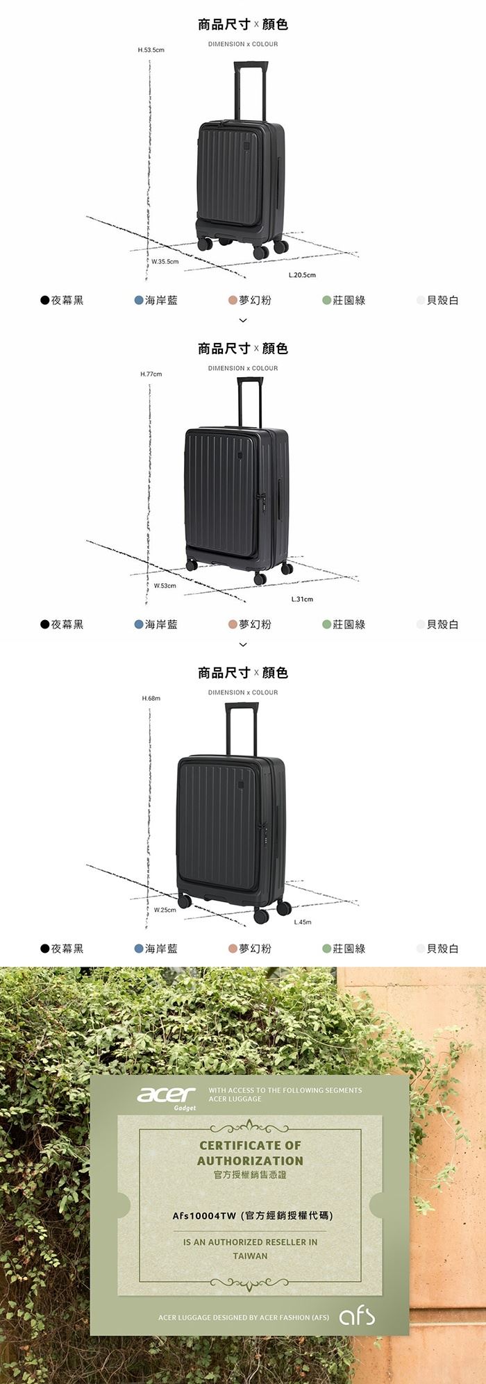 Acer行李箱保固:原廠保固:12個月 保固內容:於電商平台、經銷代理商及其他團購通路購買而需返修者,憑保固卡/發票/購買證明/序號標,享有12個月免費保固。若已超過保固期將酌收費用(例:服務費、運費)。 保固範圍:行李箱外在可替換零件如拉桿、輪子、輪座、手把、海關鎖。 非保固範圍:箱體外殼、拉鍊、內裡布、束/織帶、行李箱內部零件、拉鍊片、拉鍊頭…等五金配件。 商品使用上有任何不清楚地方請勿私自蠻力破壞,建議拍照/影片等方式詢問原廠或經銷平台通路,以避免影響保固權益。 ※所有商品外殼(含軟硬箱)均不再保固項目內;因外力因素造成損壞如機場託運、貨運寄送等因素,請逕向航空/貨運公司提出索賠要求,本公司不列於保固範圍。 |