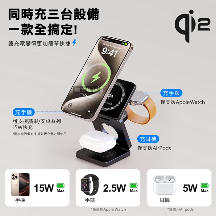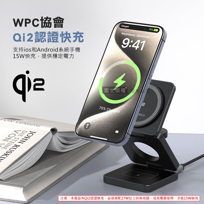| 【注意事項】 | 本產品Qi2認證快充,如需15W快充模式,需搭配"27W"以上的車充頭或充電器使用 |