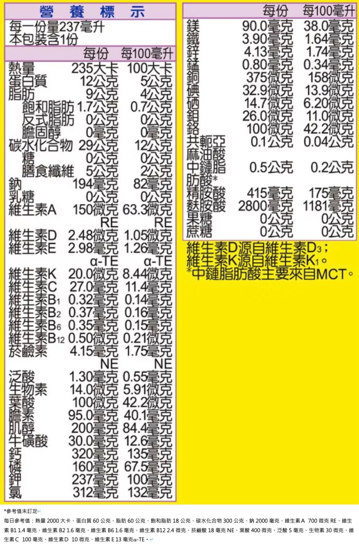 | 內容物(完整成份/食品添加物) | 水(逆滲透水)、麥芽糊精、酪蛋白(含麩胺酸、精胺酸)、紅花籽油(含共軛亞麻油酸)、菊糖(菊苣纖維)、難消化性麥芽糊精(Fibersol-2)、卵磷脂(源自大豆)、檸檬酸鈣、中鏈三酸甘油酯(MCT)、脂肪酸甘油酯、香料、氯化鉀、肌醇、氯化鈉、重酒石酸膽鹼、氧化鎂、維生素C(抗壞血酸)、氫氧化鈉、磷酸氫二鉀、氫氧化鈣、磷酸鈣、芥花油、牛磺酸、檸檬酸鉀、鹿角菜膠(鹿角菜膠,萃取自紅藻、葡萄糖)、金盞花萃取物(Lutemax含葉黃素)、焦磷酸鐵、矽樹脂(矽樹脂、脂肪酸山梨醇酐酯、聚山梨醇酐脂肪酸酯六十五、羧甲基纖維素鈉、葡萄柚籽萃取物、水)、鉬酵母、β胡蘿蔔素(麥芽糊精、阿拉伯膠、中鏈三酸甘油酯、蔗糖、β胡蘿蔔素、L-抗壞血酸鈉(抗氧化劑)、二氧化矽、維生素E(抗氧化劑))、硫酸鋅、葡萄糖酸錳、維生素E(乙酸dl-α生育醇酯、麥芽糊精、辛烯基丁二酸鈉澱粉、二氧化矽)、硒酵母、菸鹼酸、維生素A醋酸鹽(麥芽糊精、阿拉伯膠、玉米澱粉、維生素A醋酸鹽、維生素E(抗氧化劑))、本多酸鈣、維生素B1(鹽酸硫胺明)、維生素D3(辛烯基丁二酸鈉澱粉、蔗糖、L-抗壞血酸鈉(抗氧化劑)、中鏈三酸甘油酯、二氧化矽、維生素E(抗氧化劑)、膽鈣化醇)、維生素B12(麥芽糊精、檸檬酸鈉、檸檬酸、氰鈷胺明)、硫酸銅、煙鹼酸鉻(ChromeMate、氯化鈉)、維生素B2(核黃素)、維生素B6、維生素K1(阿拉伯膠、蔗糖、維生素K1)、葉酸、碘化鉀、生物素。 |