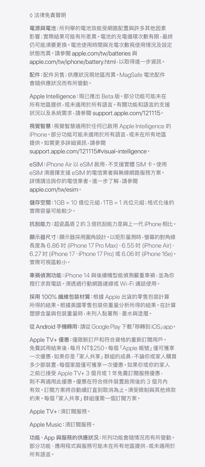 | 【注意事項】 | 【購物須知】《 購買前請先詳閱以下注意事項 》 一、 依「消費者保護法」規定,消費者享有商品貨到日起7天(含例假日)猶豫期的權益,但「猶豫期並非試用期」,如購買商品為全新品,拆封使用後即無法退貨。 二、 Apple商品為特殊3C產品,一經連上網路(含啟動wifi)、登入Apple ID或連結上iTunes後,該商品即被註冊並開始計算商品保固時間,經註冊之商品即無法還原,因此外盒膠膜以及外盒一旦拆封後保固時間開始計算,如有上述情形發生將不受理退換貨,故請在購買前確定清楚。 三、Apple商品於七天內非人為因素的新品功能性不良,依Apple原廠檢測確認,消費者可至Apple全省授權維修中心協助處理,此為Apple原廠於全台通路處理方式,無法直接由平台更換給客戶,保固期間售後服務皆由Apple原廠負責。 四、商品開機登入後即享有Apple原廠一年保固(保固規範請依原廠公告),保固範圍請詳見商品說明書,或至Apple官網查詢(https://www.apple.com/tw/);序號開通後使用有任何問題、售後服務,由全台Apple原廠授權服務中心檢測維修。 五、如因新品功能性不良且符合原廠DOA之規範申請退貨的商品必須回復原狀(須回復至商品到貨時的原始狀態)並且保持完整包裝(包括商品本體、配件、贈品、保證書、原廠包裝、商品包裝外盒完整性及所有附隨文件或資料的完整性),切勿缺漏任何配件或損毀原廠外盒,如不完整依Apple原廠規定需支付整新費售價30%。 六、為保障您的權益,請於收到物品後立即開啟檢視是否正確與完整,若有任何問題請立即與客服人員聯繫,若七日內無立即反應,恕不接受退換貨。 七、為維護彼此雙方權益,建議您開箱時【全程錄影】,若有與訂單不符、商品瑕疵等情況,請立即並提供完整錄影檔與客服人員。 八、再次提醒依原廠規範以下情況無法申請辦理退換貨,煩請留意免影響您的權益: (1)7天猶豫期≠試用期或者超過七天猶豫期。 (2)已使用商品。 (3)個人主觀因素ex:顏色/與想像不符..等。 (4)不符合原廠DOA規範。 九、因包裝材質特性無法避免運送過程中的稍微碰撞而產生細微瑕疵,不介意者在下單購買,若外盒完主美義者,建議至實體店面親自挑選。 十、請確認已閱讀上述說明,接獲您訂單後,將視同您己詳閱上述購買需知並同意本條款內容無誤!!感謝您的購買。 |