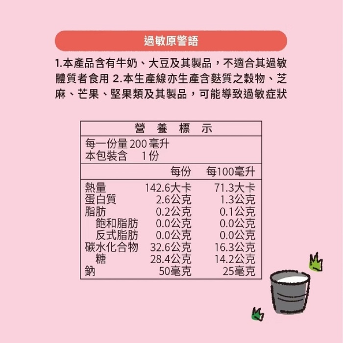 | 過敏原資訊 | 本產品含有牛奶及其製品,不適合其過敏體質者食用。本生產線亦生產含穀類(麩質),大豆,芝麻,芒果,堅果類及其製品,可能導致過敏症狀。 |