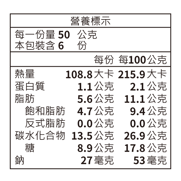 | 過敏原資訊 | 本產品含牛奶、蛋、麩質之穀物、堅果類及其製品,不適合其過敏體質者食用。本產品生產製程廠房,其設備或生產管線有處理芒果、芝麻、花生。 |