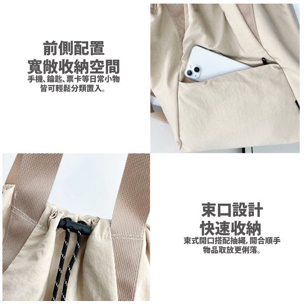 ■束口設計,快速收納 中束式開口搭配抽繩,開合順手,物品取放更俐落。