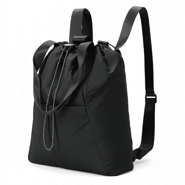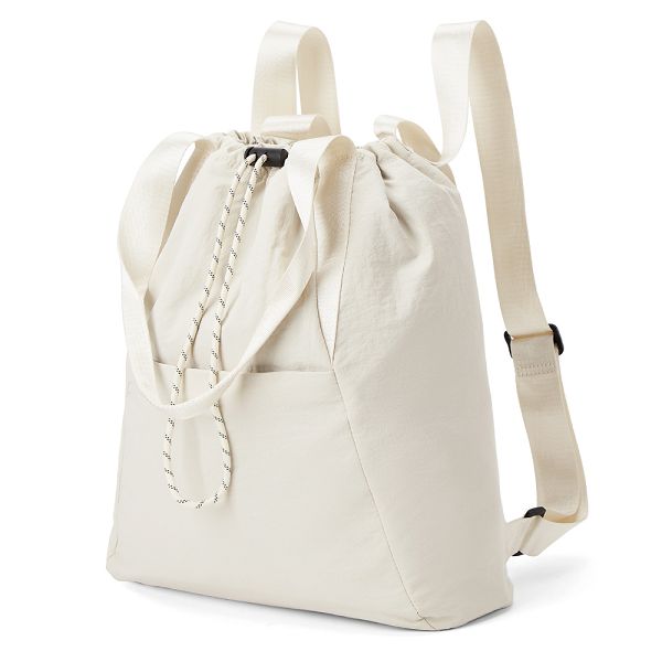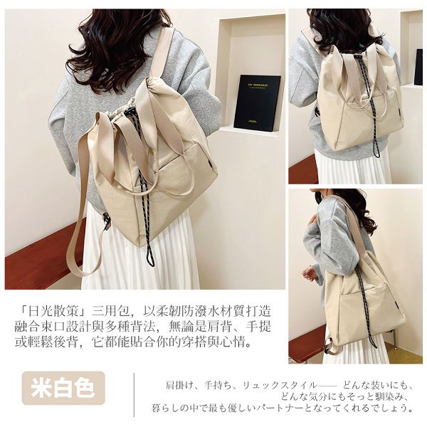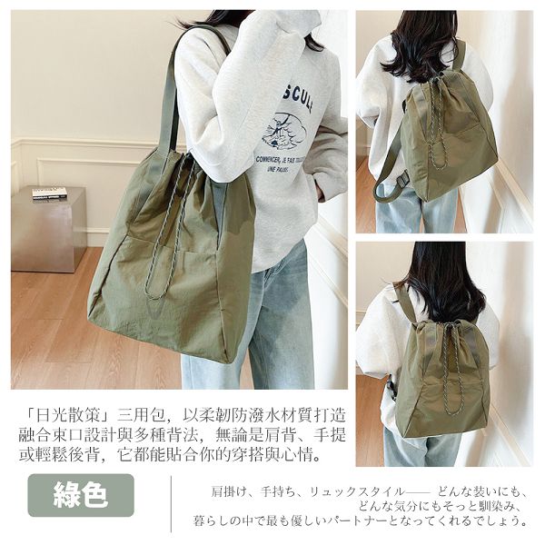 「日光散策」三用包,以柔韌防潑水材質打造,融合束口設計與多種背法