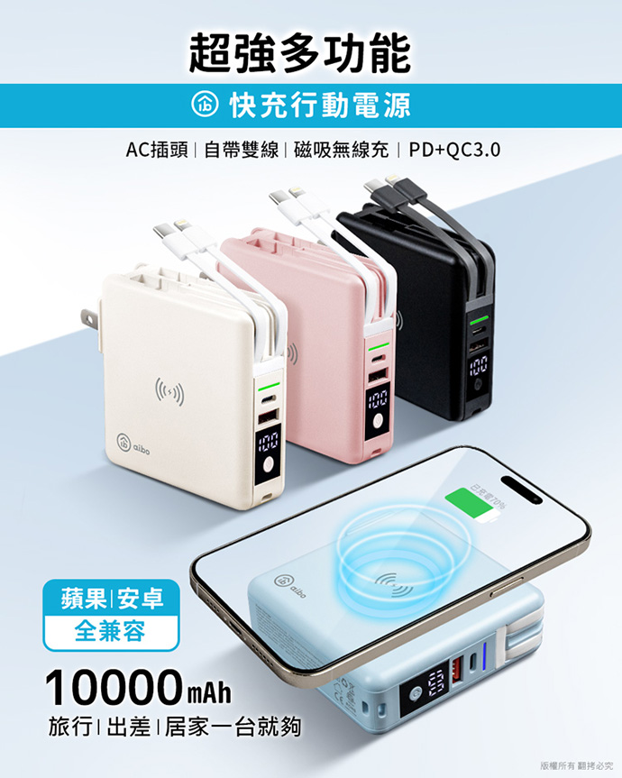 | 【商品名稱/型號】 | 【aibo】PD+QC快充無線磁吸行動電源(自帶線)10000mAh [加贈收納保護包] |
