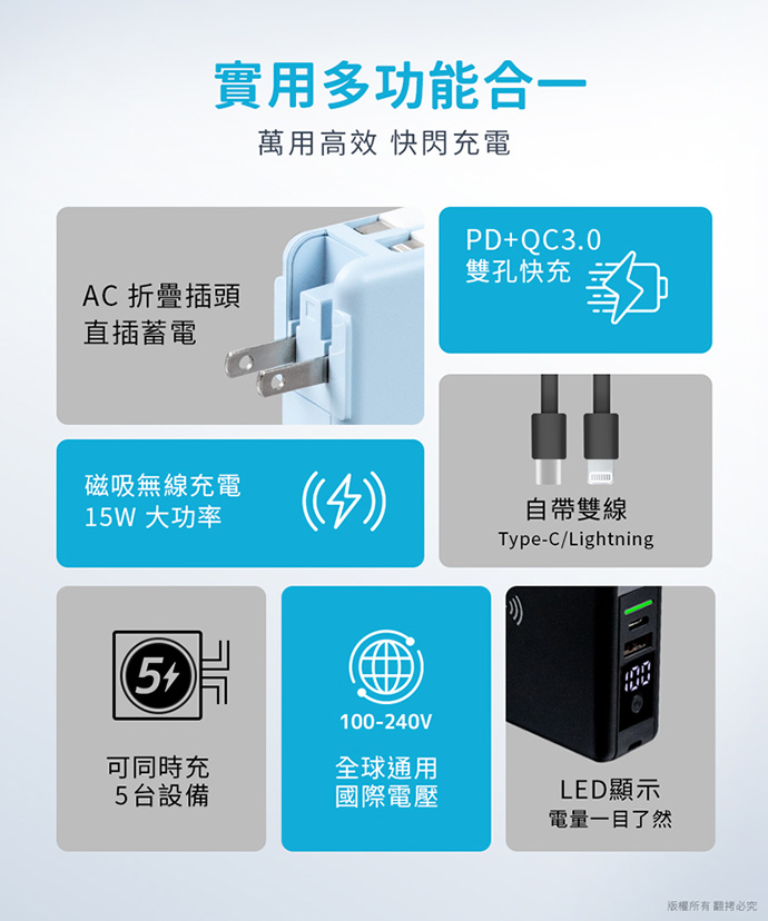 超強多功能快充行動電源,自帶Type-C/Lightning雙線,