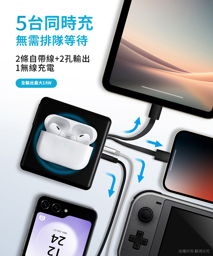 可同時為5台裝置進行充電(2條自帶線+2孔輸出+1無線充電)