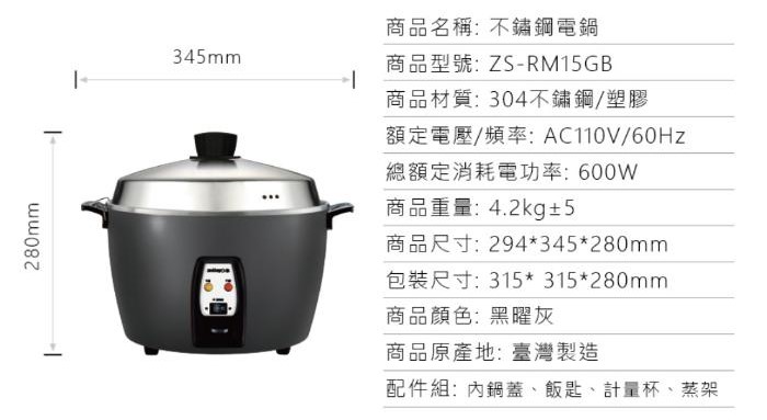 | 商品名稱 | ZUSHIANG日象 15人份不鏽鋼電鍋-黑曜灰ZS-RM15GB |