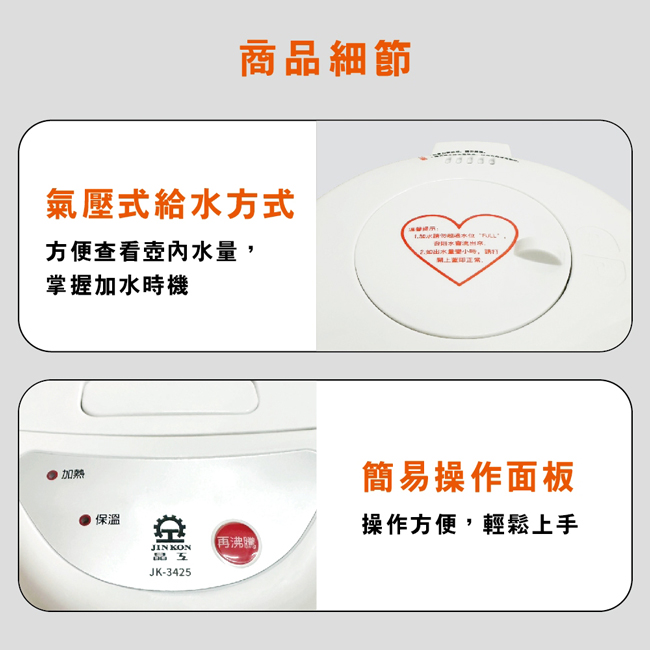 | 商品名稱 | 【晶工牌】2.5L氣壓電熱水瓶 JK-3425 |