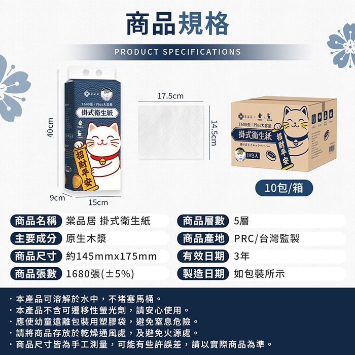 | 商品名稱 | 【箱購】《棠品居》掛式衛生紙(1680張/336抽x10包/箱) |