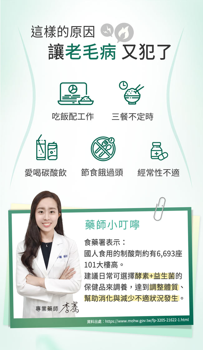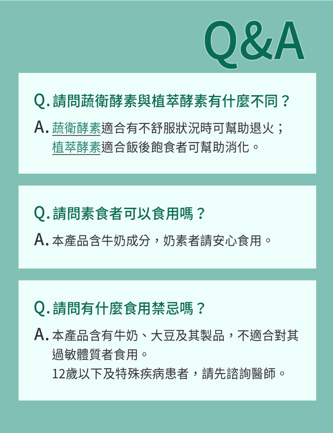 | 內容物 (完整成份/食品添加物) | 歐洲大豆發酵萃取物、綜合消化酵素(澱粉酵素、葡萄糖澱粉酵素、植物酵素(脂肪分解酵素、蛋白質分解酵素、澱粉酵素)、植酸酵素、果膠酵素、脂肪分解酵素、蛋白質酵素、轉化酵素、蛋白質分解酵素Protease 4.5、鳳梨酵素、β-葡聚醣酵素、纖維素分解酵素、蛋白質分解酵素Protease 3.0、半纖維素分解酵素、木質素酵素、乳糖酵素、木瓜酵素、胜肽酵素、蛋白質分解酵素Protease 6.0、澱粉糖化酵素、麥芽糊精)、微結晶狀α-纖維素、碳酸鈣、碳酸鎂、鳳梨酵素、專利複合乳酸菌(戊糖乳桿菌 LPS16、植物乳桿菌 LP23、瑞士乳桿菌 LA27)、交聯羧甲基纖維素鈉、葡萄糖酸鋅、高防潮水性膜衣(聚乙烯醇、二氧化鈦、滑石粉、卵磷脂、玉米糖膠)、聚乙烯吡咯烷酮、硬脂酸鎂、二氧化矽、二氧化鈦、聚乙二醇(聚乙二醇、二丁基羥基甲苯)、羥丙基甲基纖維素(羥丙基甲基纖維素、水、氯化鈉)。 |
