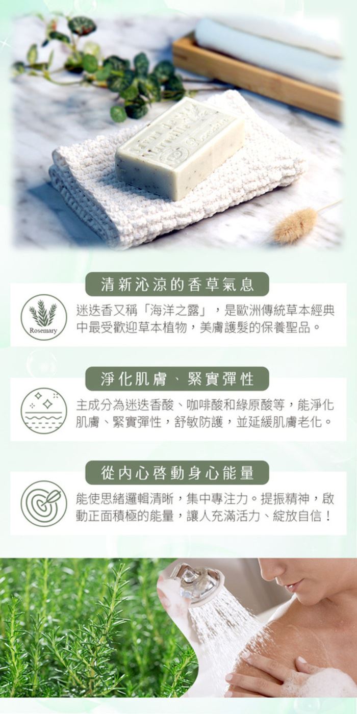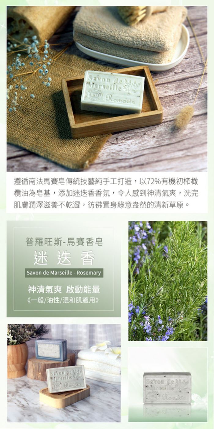 遵循南法馬賽皂傳統技藝純手工打造,以72%有機初榨橄欖油為皂基,添加迷迭香香氛,令人感到神清氣爽,洗完肌膚潤澤滋養不乾澀,彷彿置身綠意盎然的清新草原。