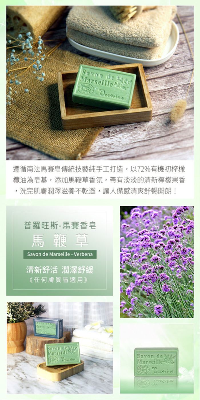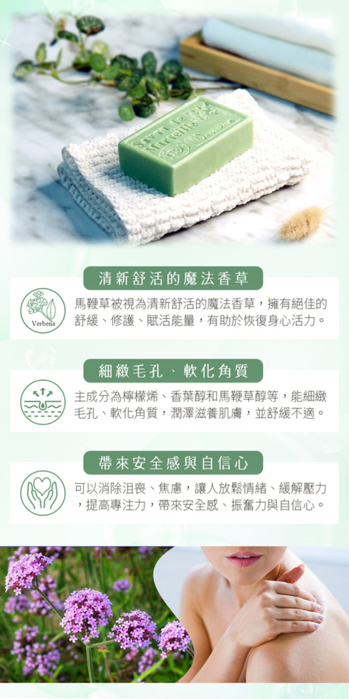 遵循南法馬賽皂傳統技藝純手工打造,以72%有機初榨橄欖油為皂基,添加馬鞭草香氛,帶有淡淡的清新檸檬果香,洗完肌膚潤澤滋養不乾澀,讓人備感清爽舒暢開朗!