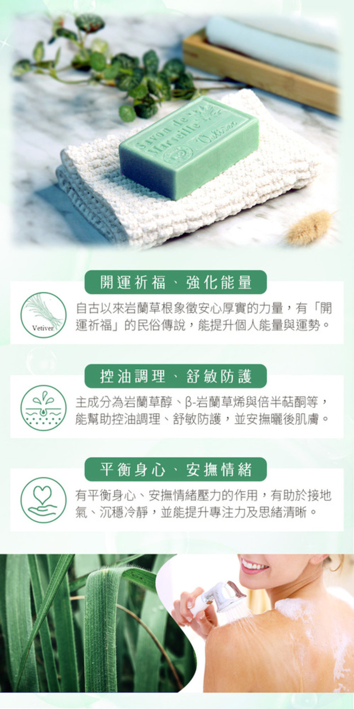 遵循南法馬賽皂傳統技藝純手工打造,以72%有機初榨橄欖油為皂基,添加岩蘭草香氛,帶有濃郁豐富的木質香調,洗完肌膚潤澤滋養不乾澀,感覺舒適安穩、放鬆平靜。