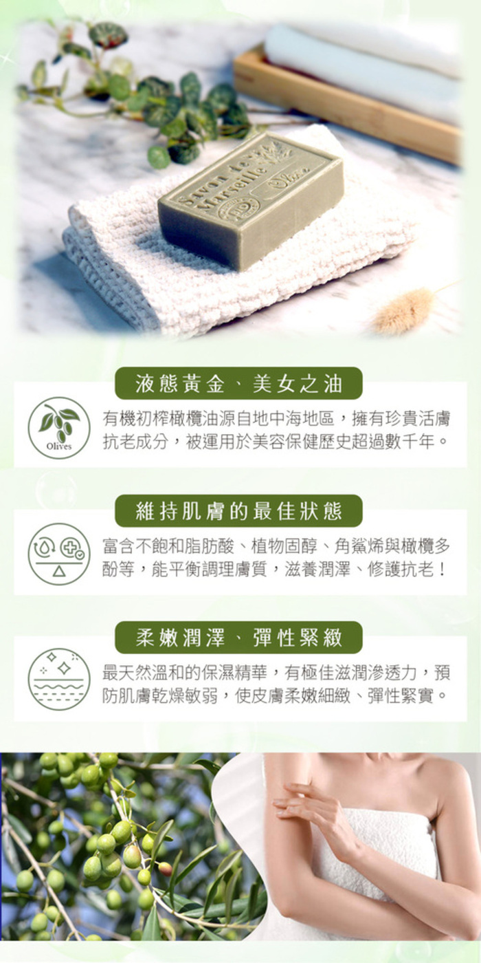遵循南法馬賽皂傳統技藝純手工打造,以有機初榨橄欖油為皂基,