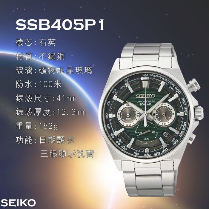| 【商品名稱】 | 【SEIKO】極速運動三眼計時鋼帶錶 SSB405P1 [加贈手環][平輸] |