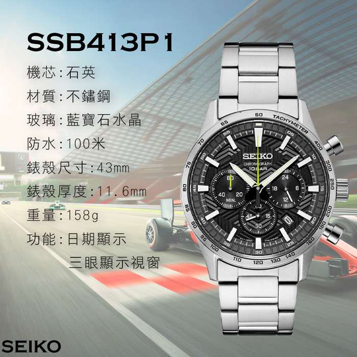| 【商品名稱】 | 【SEIKO】極速賽車三眼計時鋼帶錶 SSB413P1 [贈手環][平輸] |