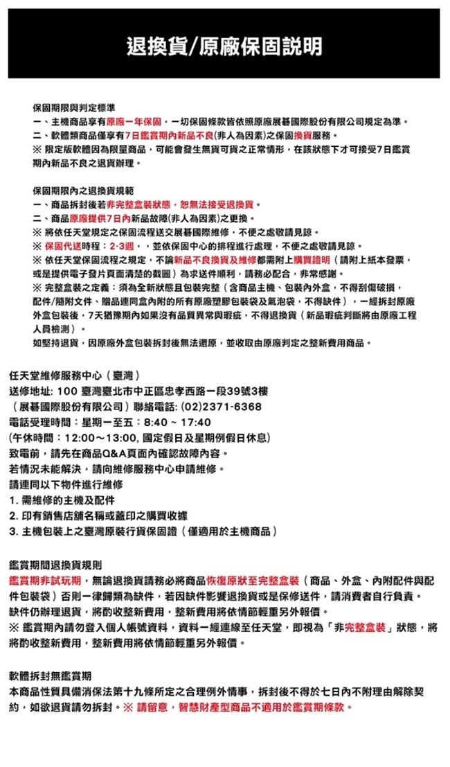 | 【保固說明】 | 一、本產品享有原廠一年保固,一切保固條款與狀況判定標準皆依照原廠展碁國際股份有限公司規定為準。 二、本商品拆封後若非完整狀態,恕無法接受退換貨。 三、本商品原廠提供7日內新品故障(非人為因素)之換貨。 ※將依任天堂規定之保固流程送交展碁國際維修,不便之處敬請見諒。 ※重要:商品經拆封即不可退貨,任何送件保固維修、換貨皆須保留『完整盒裝:主產品及所有配件,連同所有原廠包裝袋』必須保持完整、齊全不得缺件損壞。 ※由我司代送保固流程約要跑2-3週,並依保固中心的排程進行處理,不便之處敬請見諒。 ※依任天堂規定之保固流程,不論新品不良的換貨或維修都需附上購買證明(請附上紙本發票,或是提供電子發票頁面清楚的截圖),並建議預錄開箱影片,以維護自身權益,為求送件順利,請務必配合,非常感謝。 |