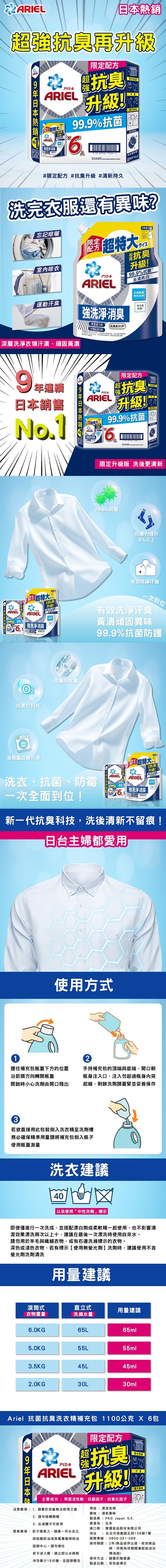 | 品名 | Ariel 抗臭新配方洗衣精補充包 1100公克 X 6入 |