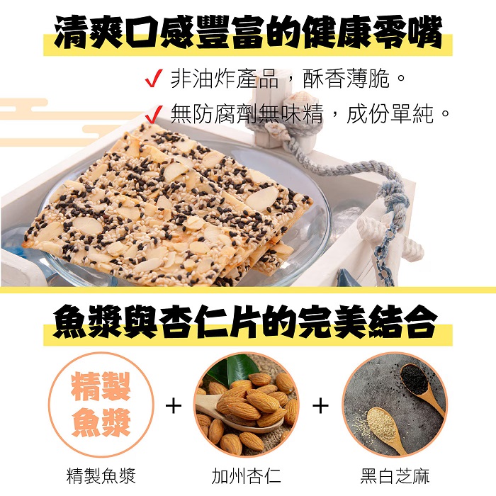 | 成分 | 鱈魚杏仁脆片: 魚漿(含鱈魚)、杏仁、葡萄糖、小麥麵粉、黑芝麻、白芝麻、砂糖、糖粉、食鹽、昆布抽出物、複方抗氧化劑(麥芽糖醇、混合濃縮生育醇、水、芥花油(菜籽油)、脂肪酸甘油脂、大豆卵磷脂、酒精、甘油)、辣椒粉、酵母抽出物。 |