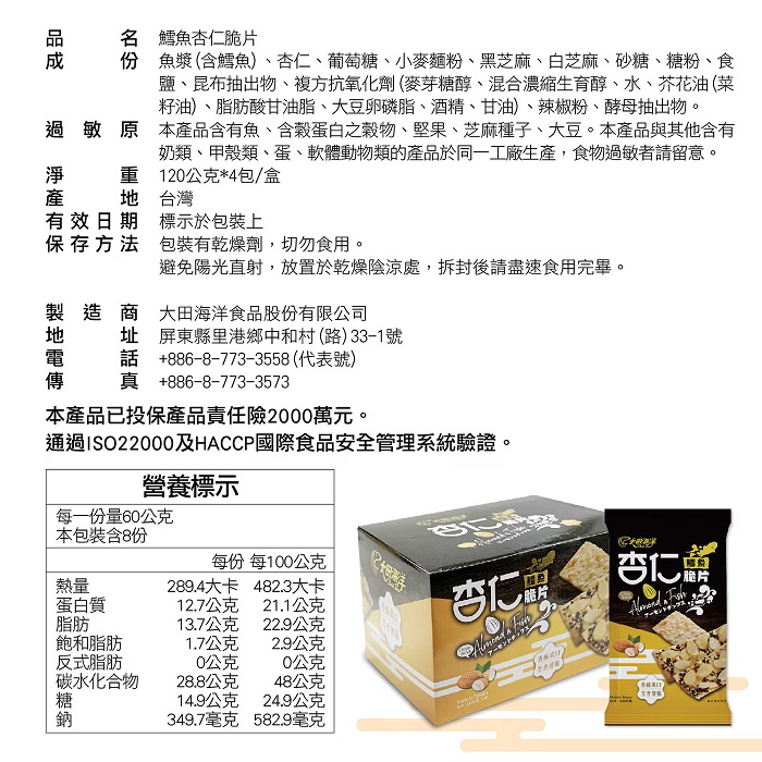 | 品名 | 大田海洋 鱈魚杏仁脆片 120公克 X 4入 |