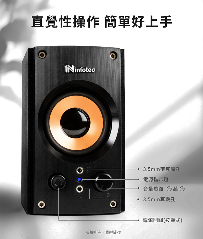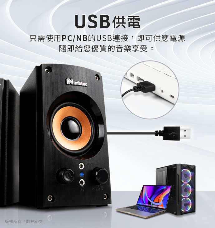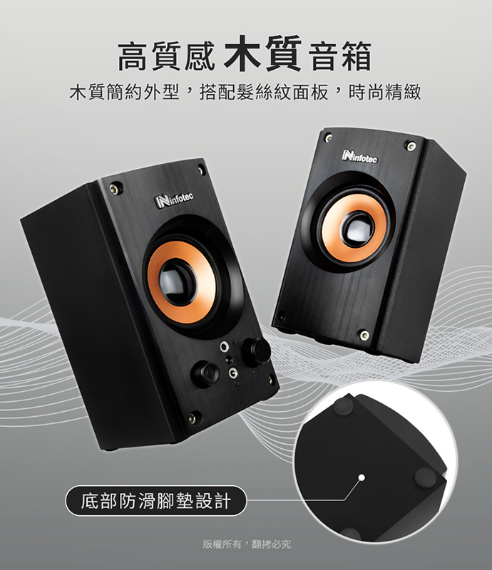 | 【商品名稱或型號】 | 商品名稱:【infotec】2.0聲道USB二件式木質喇叭580W(P.M.P.O) SP-RX8 商品型號:INF-SP-RX8 |