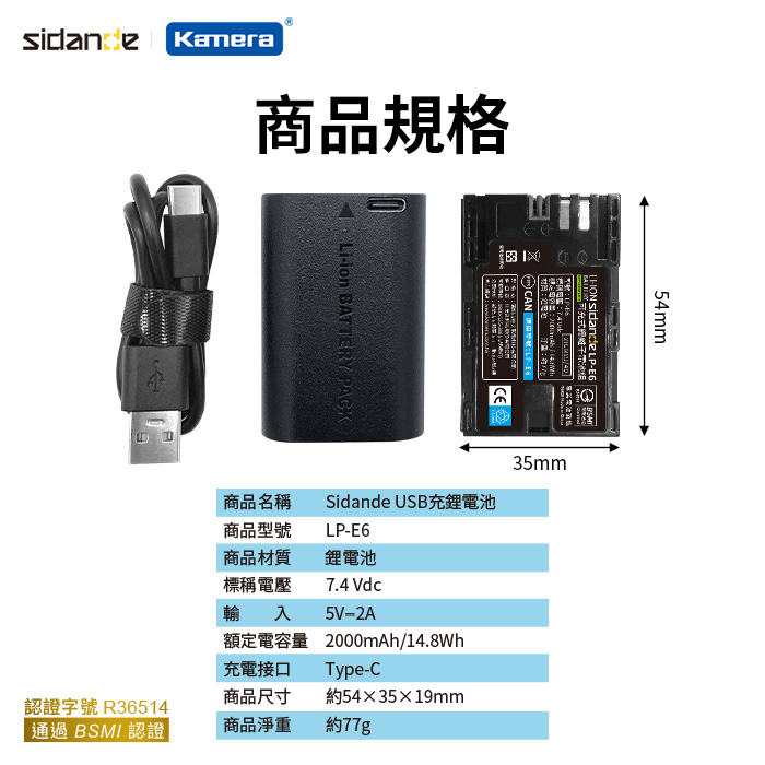 | 【商品名稱或型號】 | 【Sidande 】LP-E6 USB充電式鋰電池(TypeC供電) |