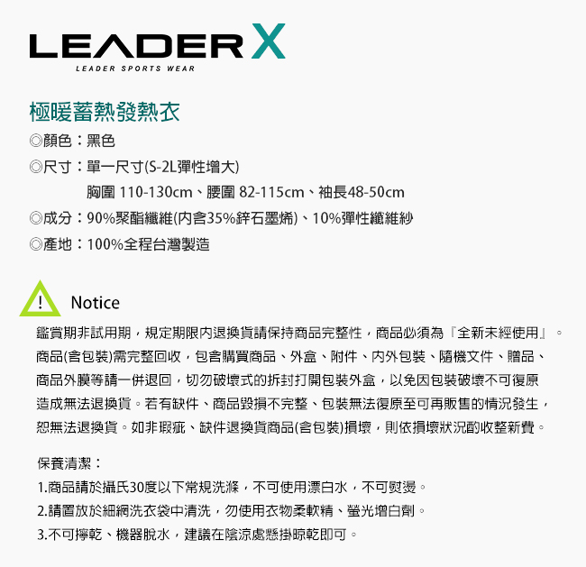| 【商品名稱】 | 【Leader X】極暖蓄熱鋅石墨烯發熱衣(男款)(F) [5件組] |