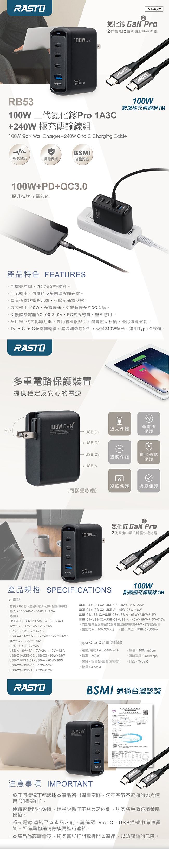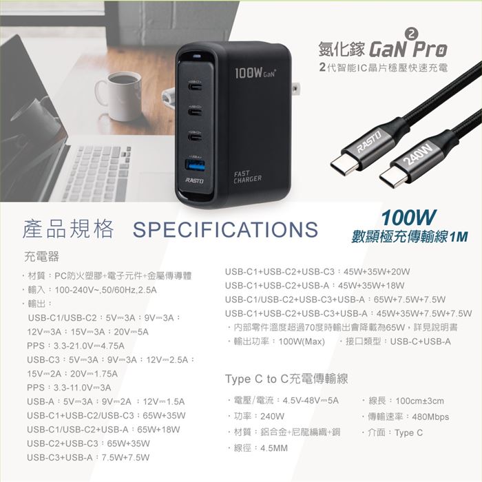 | 商品名稱 | RASTO 100W二代氮化鎵充電器+240W充電線組RB-53 |