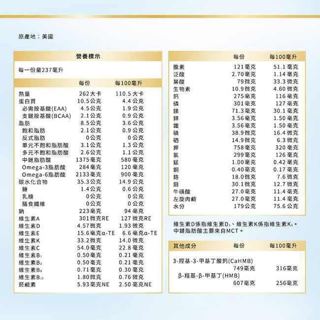 | 內容物(完整成份/食品添加物) | 水.麥芽糊精.酪蛋白鈉.濃縮牛奶蛋白(含乳清蛋白、酪蛋白).菜籽油.玉米油.中鏈三酸甘油酯(MCT).檸檬酸鉀.分離大豆蛋白.3-羥基-3-甲基丁酸鈣.磷酸鎂.卵磷脂.氯化鉀.磷酸氫二鉀.微結晶狀α-纖維素.磷酸氫二鈉.氯化膽生僉.磷酸鈣.維生素C.葡萄糖.氯化鈉.羧甲基纖維素鈉.氫氧化鉀.牛磺酸.L-肉酸.維生素E.鹿角菜膠.香料(香料、辛烯基丁二酸鈉澱粉、麥芽糊精).椰子油.硫酸亞鐵.硫酸鋅.菸鹼醯胺.硫酸錳.本多酸鈣.硫酸銅.維生素B1.維生素B6.維生素B2.維生素A棕櫚酸酯.葉酸.三氯化鉻.β-胡蘿蔔素.鉬酸鈉.碘化鉀.維生素K1.硒酸鈉.生物素.維生素D3.維生素B12 |