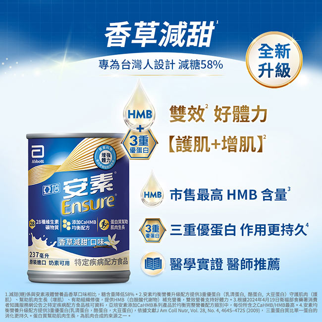 | 包裝內容/商品規格 | [買3箱送7罐]亞培安素香草減甜HMB配方237mlx30入x3箱+(贈品)亞培 安素香草減甜即飲 HMB升級配方(220ml)x7入 |