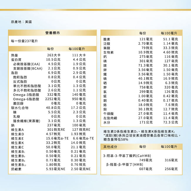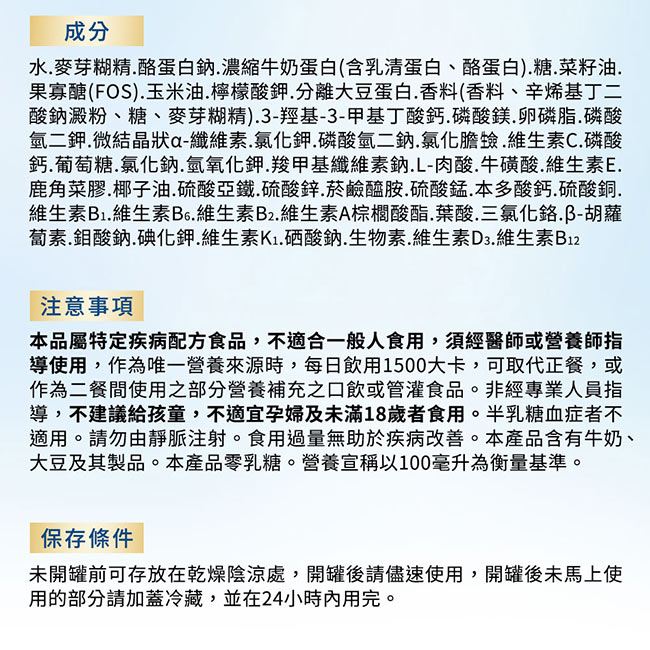 | 內容物(完整成份/食品添加物) | 水.麥芽糊精.酪蛋白鈉.濃縮牛奶蛋白(含乳清蛋白、酪蛋白).糖.菜籽油.果寡醣(FOS).玉米油.檸檬酸鉀.分離大豆蛋白.香料(香料、辛烯基丁二酸鈉澱粉、糖、麥芽糊精).3-羥基-3-甲基丁酸鈣.磷酸鎂.卵磷脂.磷酸氫二鉀.微結晶狀α-纖維素.氯化鉀.磷酸氫二鈉.氯化膽生僉.維生素C.磷酸鈣.葡萄糖.氯化鈉.氫氧化鉀.羧甲基纖維素鈉.L-肉酸.牛磺酸.維生素E.鹿角菜膠.椰子油.硫酸亞鐵.硫酸鋅.菸鹼醯胺.硫酸錳.本多酸鈣.硫酸銅.維生素B1.維生素B6.維生素B2.維生素A棕櫚酸酯.葉酸.三氯化鉻.β-胡蘿蔔素.鉬酸鈉.碘化鉀.維生素K1.硒酸鈉.生物素.維生素D3.維生素B12 |