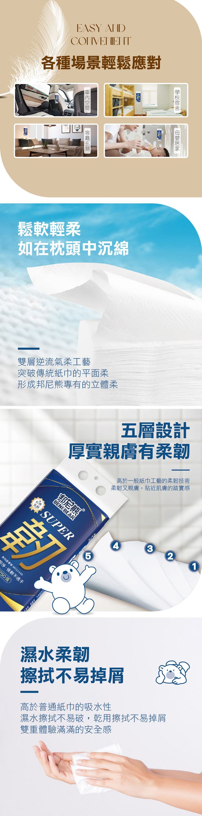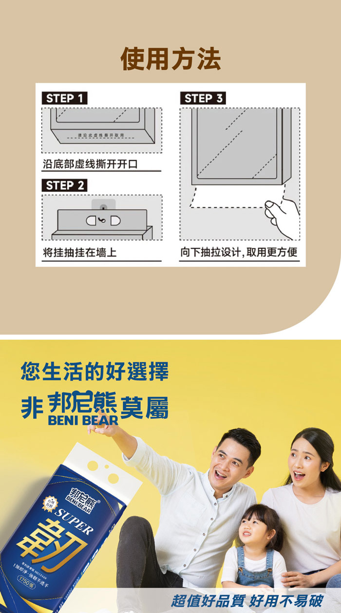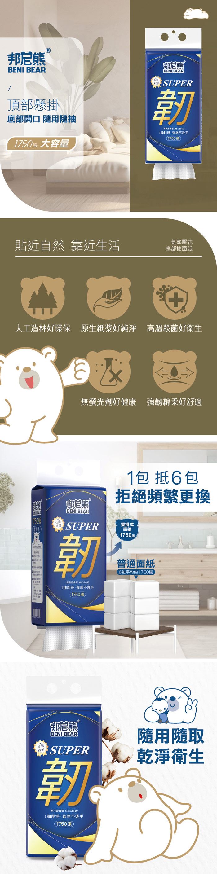 | 商品名稱 | 【BeniBear邦尼熊】五層提掛式底部抽取面紙1750張x4串-(韌) |