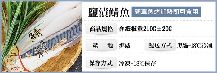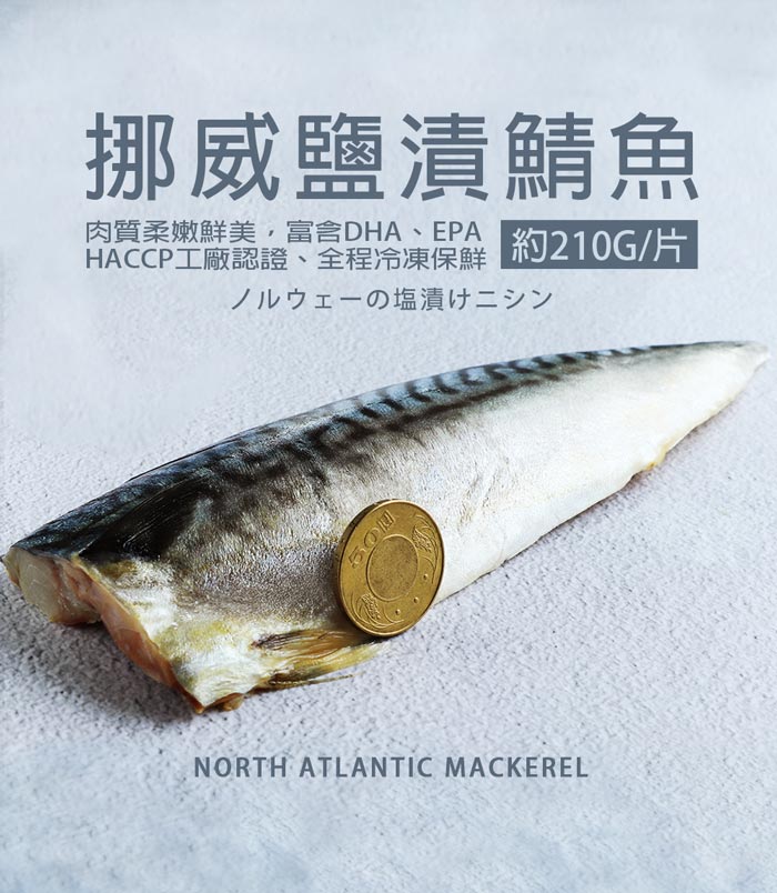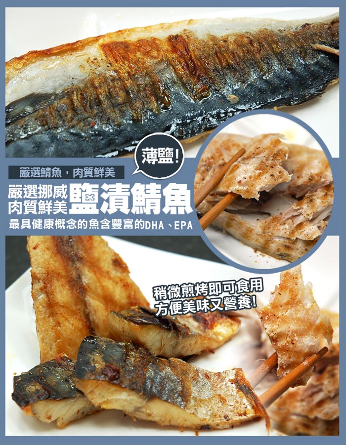 | 商品名稱 | 買1送1【築地一番鮮】厚片超大油質豐厚挪威薄鹽鯖魚10片(210g/片 加贈10片共20片) |