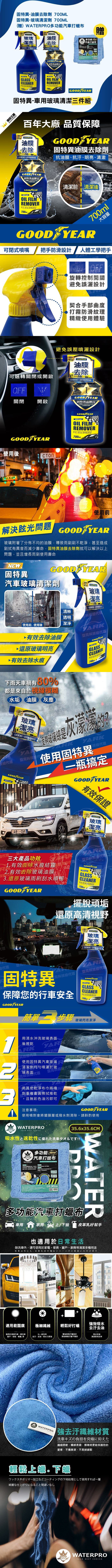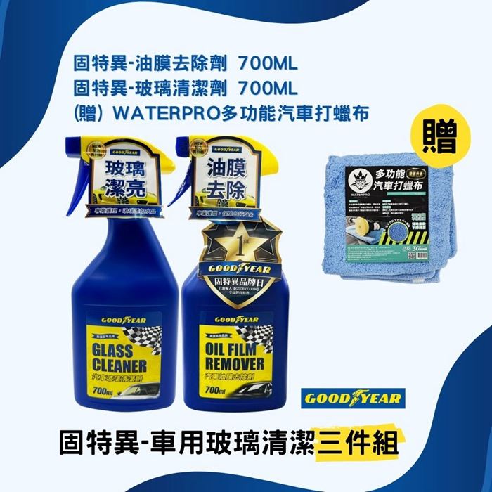 | 【規格或顏色】 | 固特異油膜去除劑700MLx1、固特異玻璃清潔劑700MLx1、WATERPRO多功能汽車打蠟布x1 |