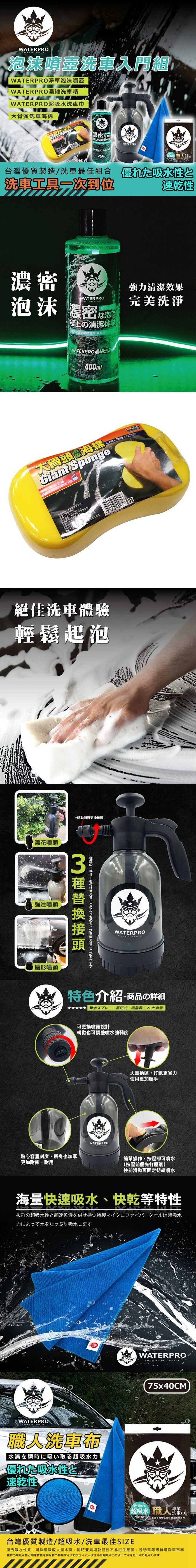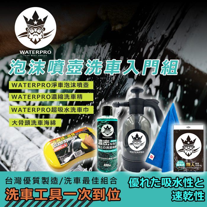| 【內容物】 | WATERPRO淨車泡沫噴壺x1、WATERPRO濃縮洗車精 400mlx1、大骨頭洗車海綿x1、WATERPRO超吸水職人專業洗車巾x1 |
