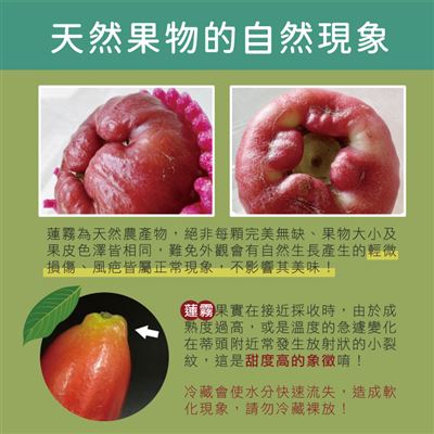 | 注意事項 | ****本商品為農產品,落蒂、輕微表皮擦傷為正常現象,重度在意者請勿下單! 1.生鮮食材取貨後,請盡速放入冰箱冷藏保鮮 2.農作物品項因以時令採收包裝為主,圖片僅供參考,實際以商品出貨為主 3.請於取貨通知,一日內取貨,因是生鮮食材無法久放敬請配合! 4.離島、宜蘭、花蓮、台東因配送區域,到貨日會與系統顯示日不同,造成不便敬請見諒。 5.因運送過程果實可能有些微果損1~3%,不為退換貨之理由,請介意者斟酌下單 6.本商品不能退貨,自105年1月1日起,生鮮食品不適用於消費者保護法第19條,並不享有7天鑑賞期。 7.商品若有疑慮,請與i預購客服中心聯繫:7ego@ptc-nec.com.tw;客服專線:0809-070-717 請體諒備貨不易、農產品保鮮期又短,勿下單又棄單! 多次棄單者,將喪失本平台購物權限! |