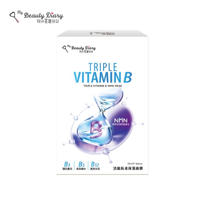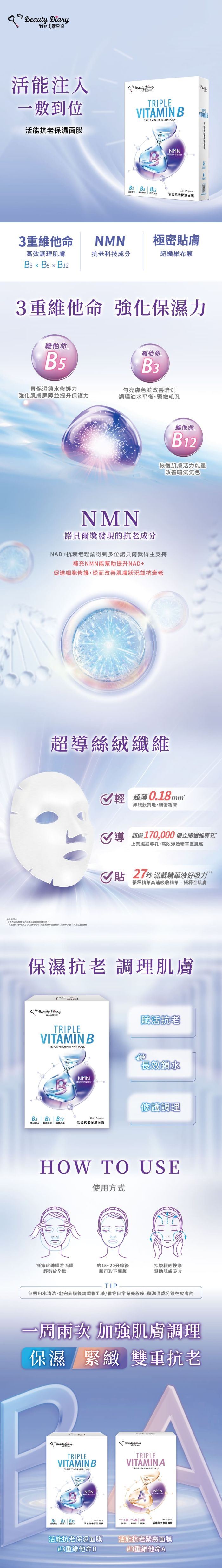 《我的美麗日記》全新推出活能抗老保濕面膜,NMN研究支持抗老成分搭配B5、B3、B12等3重維他命,高效調理膚況,達到延緩肌膚衰老、保濕修復。