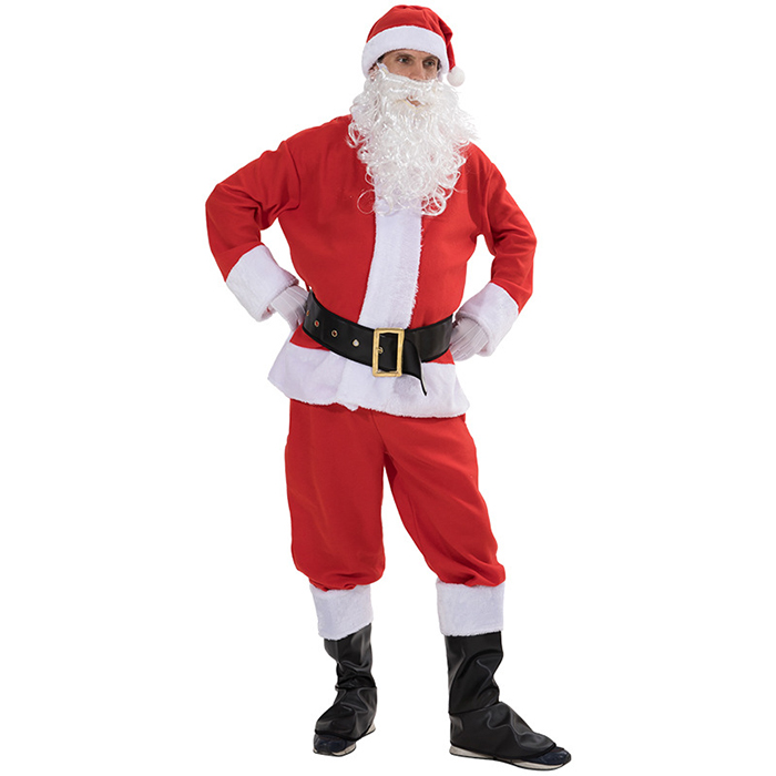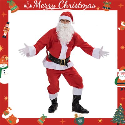 | 【商品規格】 | 內容物:帽子+上衣+褲子+腰帶+靴套+手套+白鬍子 建議尺寸(公分):胸圍156 / 腰圍70 / 袖長60 |