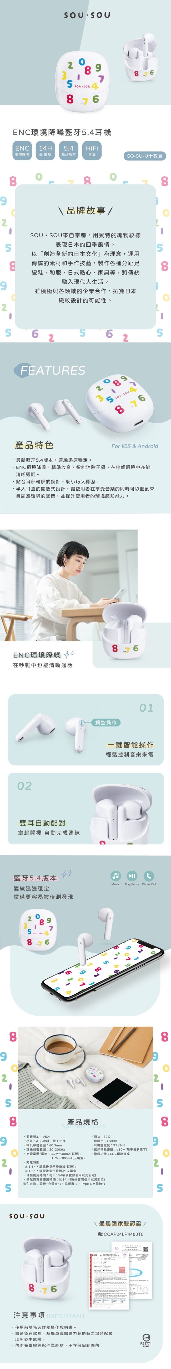 | 商品名稱 | SOU.SOU十數昆 ENC環境降噪藍牙5.4耳機 |