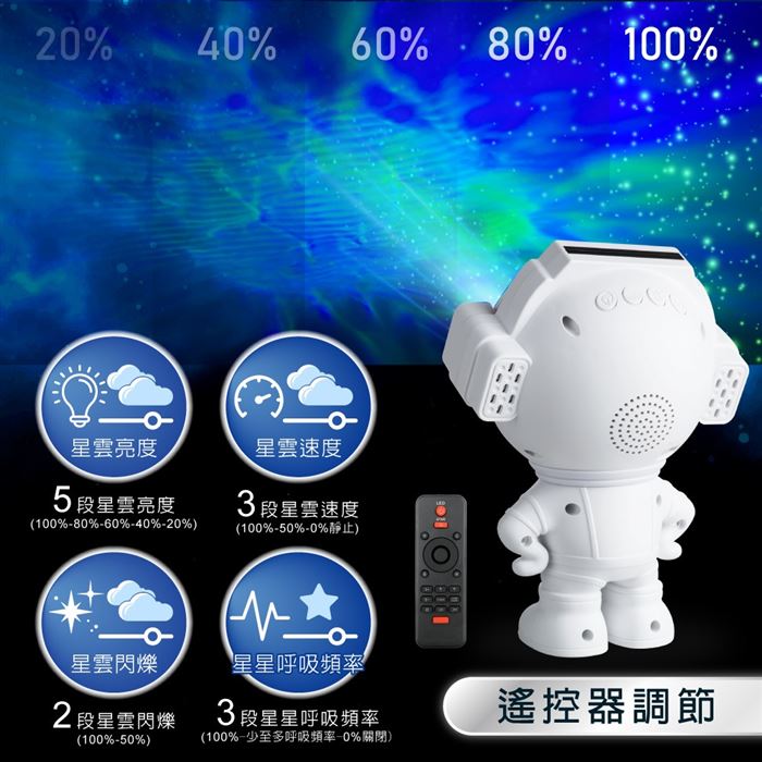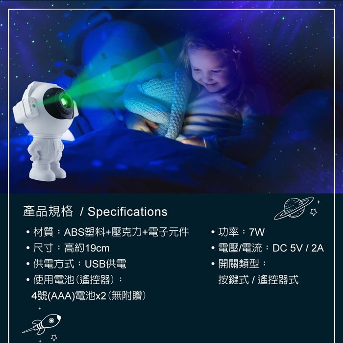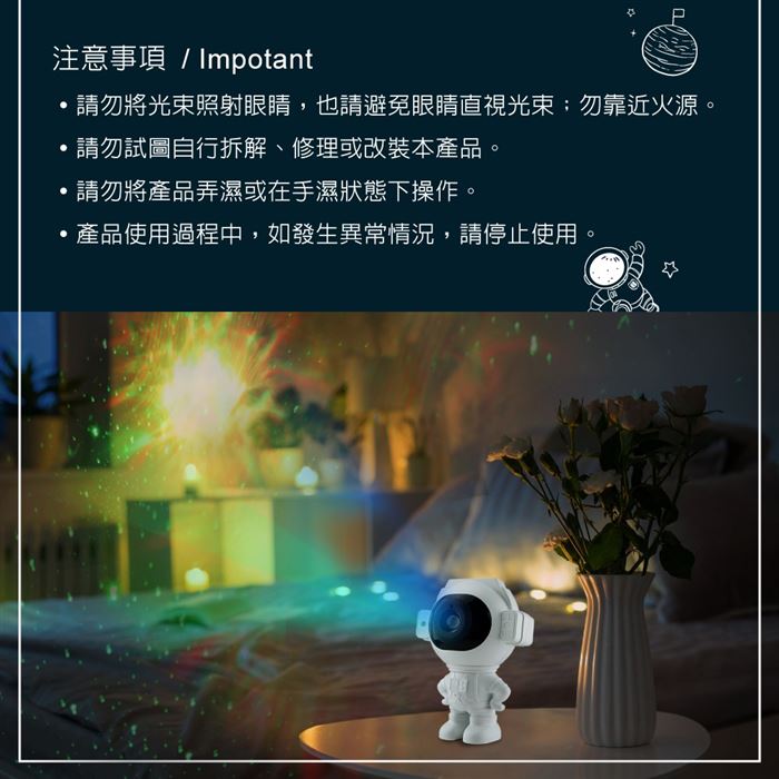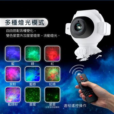.太空人造型,可調整式投影方向,磁吸式固定,可使用遙控器遠端操作,簡單方便