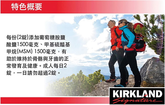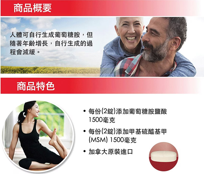 成分:葡萄糖胺鹽酸鹽(來源甲殼類)、甲基硫醯基甲烷(MSM)、微結晶狀纖維素、羥丙基纖維素、透明膜衣 (羥丙基甲基纖維素、甘油)、交聯羧甲基纖維素鈉、硬脂酸、硬脂酸鎂