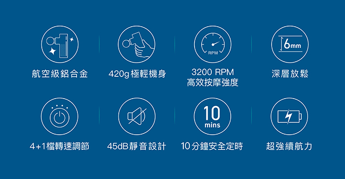 | 【內容物】 | 按摩槍x1、充電線x1、按摩頭x4、說明書x1、收納盒x1 |